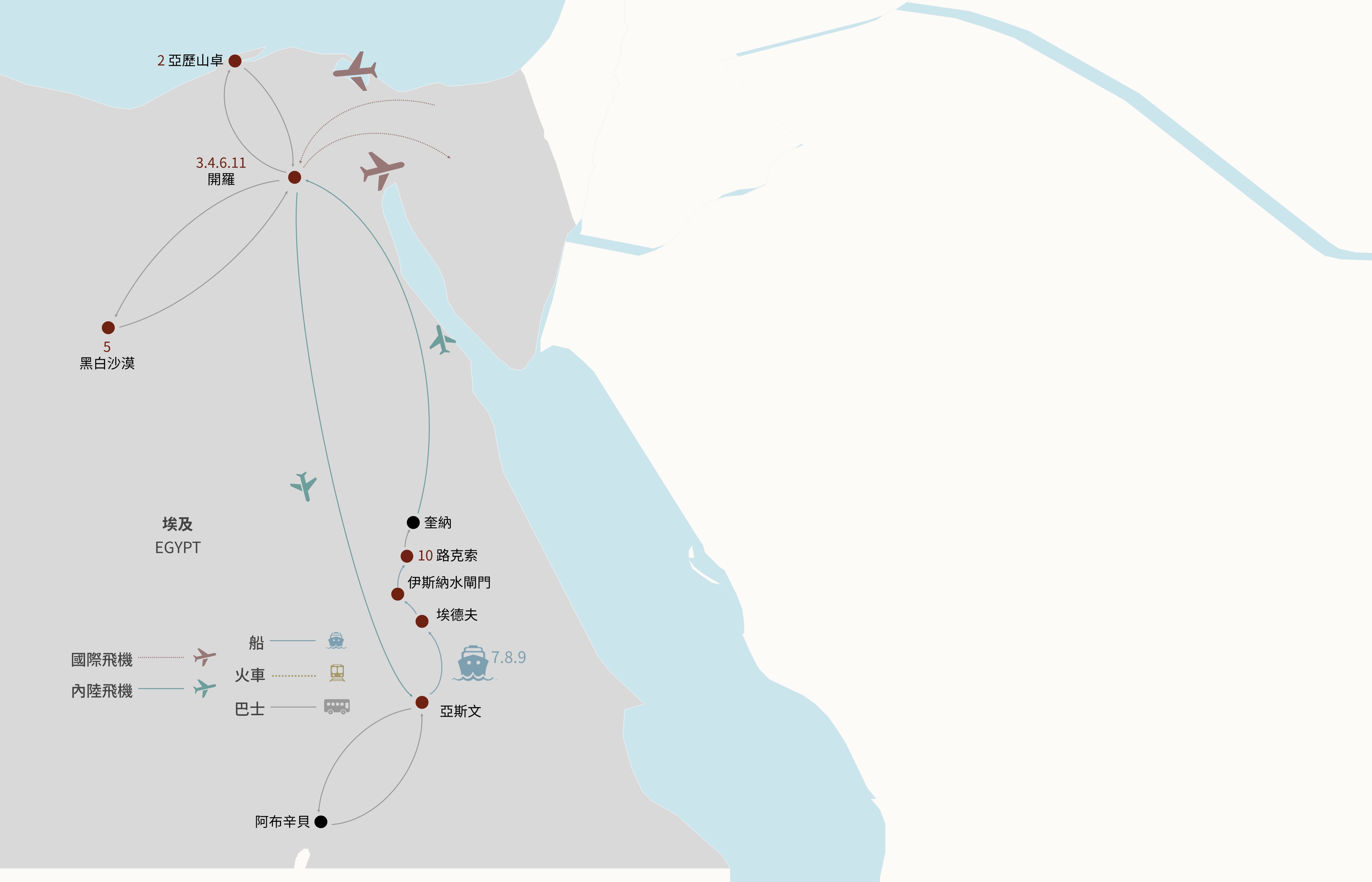 內陸段參考航班:SM90 開羅/亞斯文 08:00/10:10,請依說明會上時間為準~ 埃及國內段航班,托運行李1件23KG(長+寬+高=158cm) ,手提行李1件上限7KG。敬請留意。