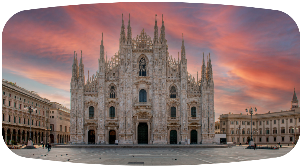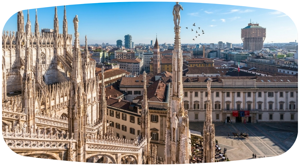 米蘭大教堂登頂如踏入雲端殿堂,白色大理石在陽光下閃耀奢華光澤。穿行於雕工細緻的尖塔之間,宛如置身藝術宮殿之巔。俯瞰米蘭全城,遠山與天際交織出高貴壯麗的極致景觀。