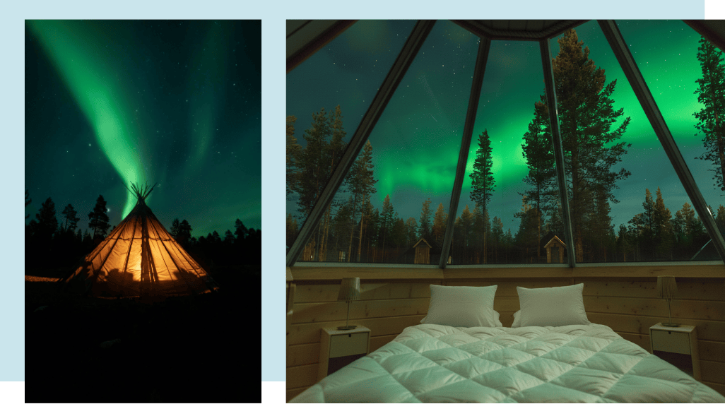 在北極樹屋的溫暖懷抱中,開啟您的極光奇遇。躺在極致舒適的柔軟床上,透過獨特設計的全景落地窗,將整片璀璨星空盡收眼底。無需踏入凜冽寒冬,只需靜候夜幕,當舞動的綠色極光如絲綢般劃過天際,您將在璀璨星辰的守護下,進入夢鄉。這不僅是一次住宿體驗,更是與自然共鳴、與極光零距離對話的藝術,為您的北國之旅寫下最浪漫、最難忘的一頁。
