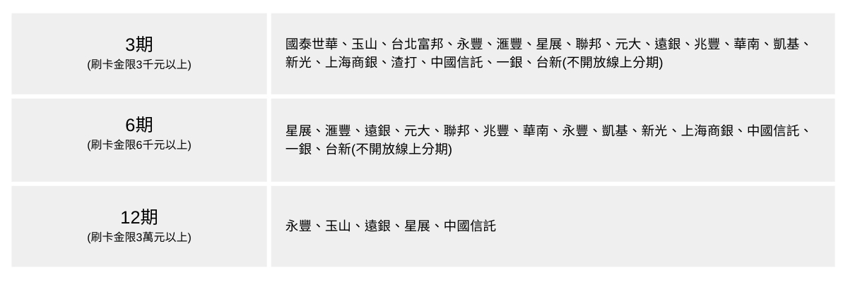 註3:各銀行適用分期之卡別依銀行官網公告為準。