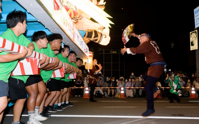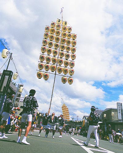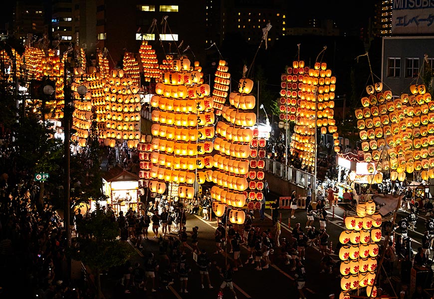 起源於江戶時代,是個對表演者充滿挑戰性、能讓觀眾驚呼連連的祭典!當夜幕降臨,人們身穿華麗的傳統服飾,表演者會將高達12公尺、重達50公斤的竹竿燈籠,在頭部、肩膀或腰部進行平衡表演,長年累積下來的技巧與耐力,讓燈籠彷彿成為夜空中懸掛的金黃稻穗,象徵著祈求五穀豐收與驅散瘟疫的閃耀希望。