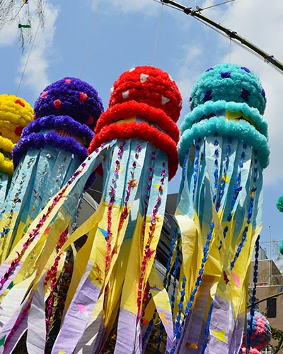 源於中國七夕文化,由戰國名將伊達政宗推廣發展,是日本最具規模的七夕活動!祭典期間,仙台市商圈將掛滿由商店街組隊製作而成的紙流蘇,人們會在流蘇上寫下對未來的期盼。當你身穿浴衣,穿梭在被彩球串淹沒的街道中,音樂演奏交織傳統演出,立即便能被周圍浪漫歡快的氛圍感染,非常適合情侶和家庭一同參與。