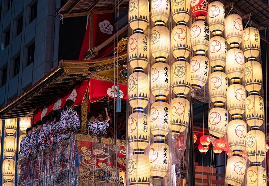 擁有超過1000年歷史的祇園祭被譽為日本三大祭典之一。7月17日與24日是華麗「山鉾」花車在京都街頭巡行的最大看點,展現日本古老工藝與文化,場面之壯觀彷彿一座行走的美術館。