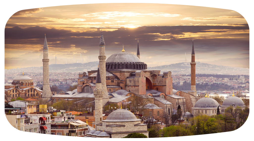 位於伊斯坦堡,是融合拜占庭與奧斯曼風格的建築奇蹟。始建於西元537年,曾為教堂、清真寺與博物館,如今為清真寺開放。其宏偉圓頂與金色馬賽克象徵東西方文明交融,為世界文化遺產代表之一。
