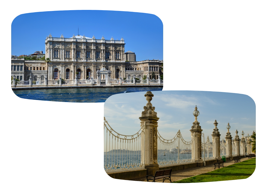 杜馬巴切皇宮(Dolmabahçe Palace)位於土耳其伊斯坦布爾博斯普魯斯海峽沿岸,是奧斯曼帝國晚期的重要宮殿,建於19世紀中期,融合了歐洲巴洛克、洛可可與新古典主義建築風格。宮殿內部裝飾極盡奢華,擁有大量水晶燈、金箔雕飾與精美壁畫,展示了奧斯曼帝國末期的富麗堂皇。杜馬巴切皇宮不僅是歷史政治中心,也是文化藝術的重要象徵。