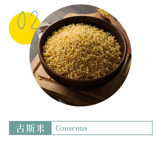 主要原料是粗粒小麥粉,搓揉 蒸製而成。古斯米是摩洛哥的文化遺產,這種由杜蘭小麥製成的粒狀麵食,經多次蒸製,搭配燉煮的肉類、時蔬及香料,是重要節慶不可或缺的佳餚。