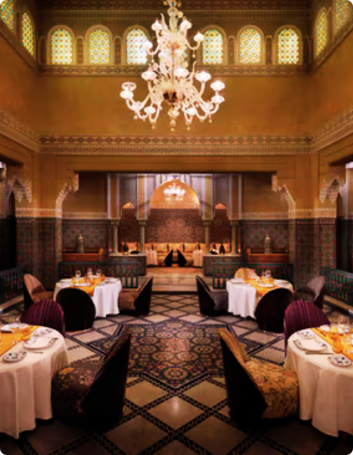 融合摩洛哥傳統建築與現代奢華設計,宛如藏在鬧市中的世外桃源。室內裝潢以暖色木質與典雅馬賽克為主,展現北非風情。室外庭院與泳池環境優雅,花園小徑、噴泉流水,營造寧靜氛圍,是放鬆身心的理想之地。