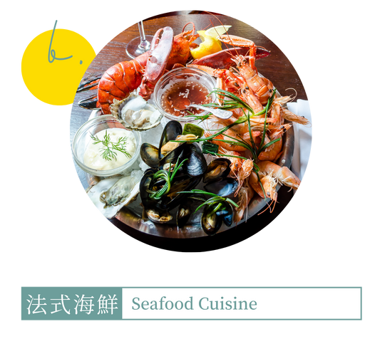以地中海的清新氣息與法式料理的精緻手法交融,法式海鮮料理展現出優雅的海洋風味。主廚嚴選每日新鮮漁獲,以白酒、香草與奶油細火烹調,保留海鮮的原始鮮甜。搭配香檳或白酒,更添法式餐桌的浪漫氛圍。