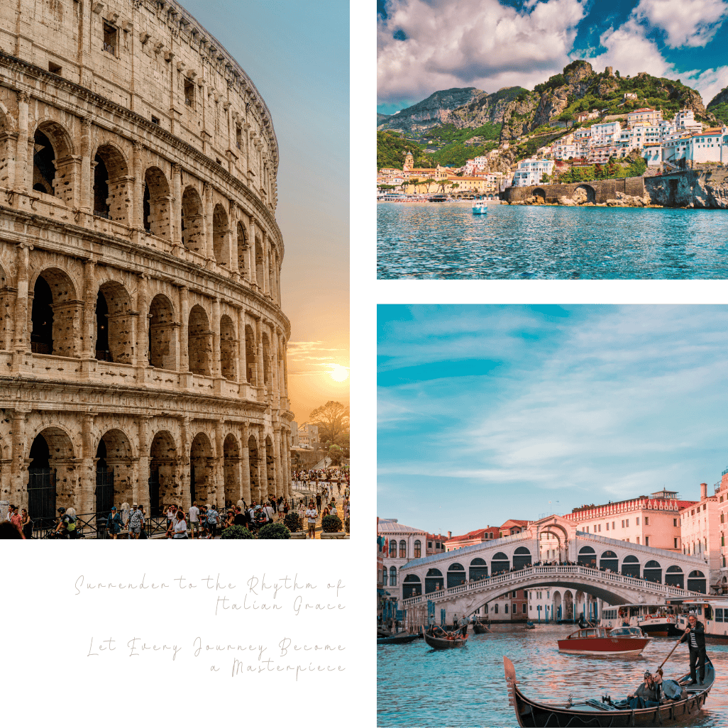從米蘭的時尚街區,到佛羅倫斯的藝術殿堂;從威尼斯的運河波光,到阿瑪菲海岸的蔚藍天際,義大利的每一座城市,都是時間雕琢出的藝術品。羅馬的圓形競技場、比薩的斜塔、托斯卡尼的莊園與卡布里的浪潮,共同譜出一首關於歷史與生活的交響詩。城市靜靜訴說著文明的厚度,陽光灑落在石板路上,彷彿仍能聽見古老時光的呢喃。