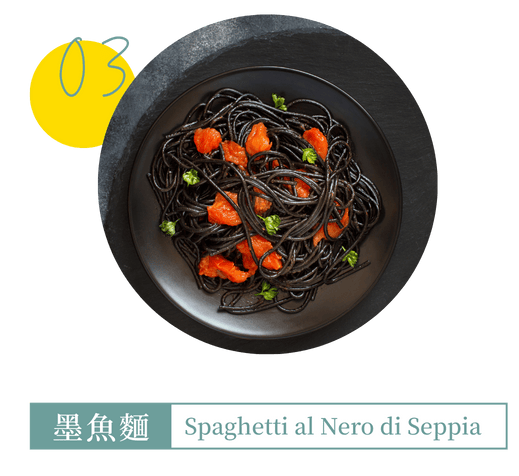 深邃的黑色麵條在盤中閃爍光澤,彷彿夜色凝成的海味詩篇。以新鮮墨魚熬製的醬汁,帶著鹹香與海洋氣息,與彈牙的義大利麵完美融合。每一口都是海風與陽光的記憶,濃郁卻不厚重,純粹展現義式料理對食材本味的極致詮釋。