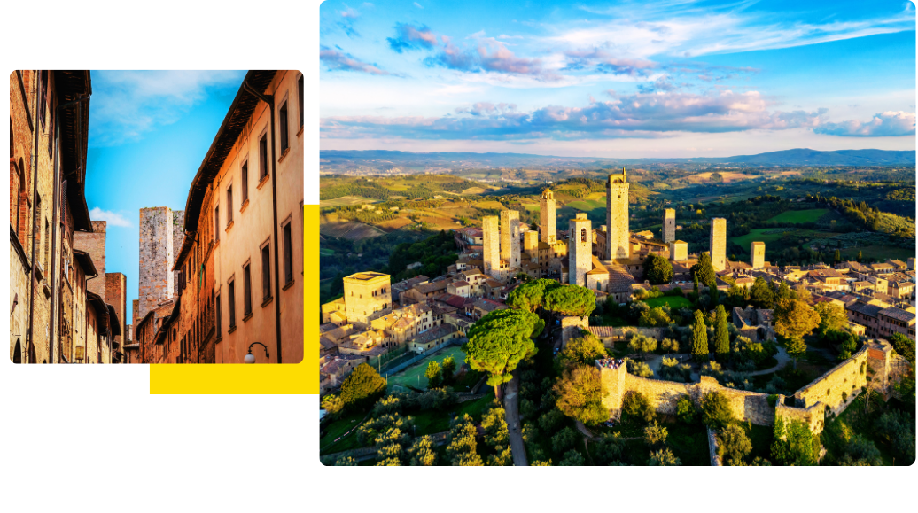 聖吉米尼亞諾被譽為「中世紀的曼哈頓」,以一座座高聳石塔勾勒出獨特的城市天際線。漫步在古老石板路上,周圍環繞著保存完好的城牆、塔樓與中世紀建築,彷彿時光在此停駐。小鎮因世界級白酒 Vernaccia di San Gimignano 聞名,廣場周邊的酒館、手工藝店與冰淇淋店散發著迷人的慢活氣息。這座山丘小鎮以其純粹、古樸與濃厚的歷史氛圍,成為托斯卡納最動人的風景之一。