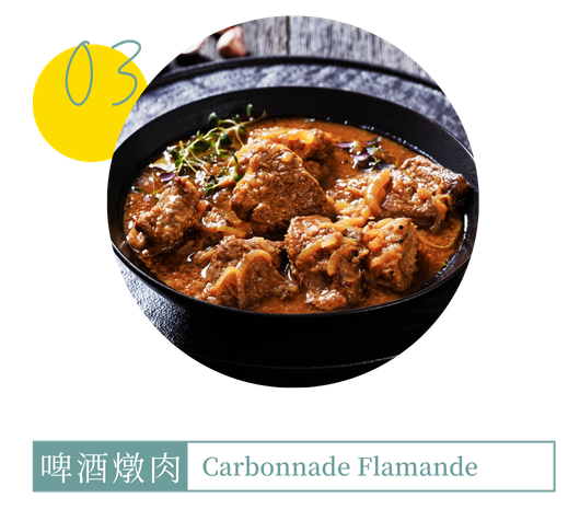 這道源自比利時的經典燉菜,將肉塊與大量洋蔥慢火熬煮。關鍵在於加入當地特產的深色修道院啤酒,利用酒香提升肉質的層次感與鮮甜,使湯汁濃郁且充滿麥芽香氣。口感鬆軟入味,搭配金黃薯條或手工麵包,是體驗佛蘭德地區最道地的家常風味。